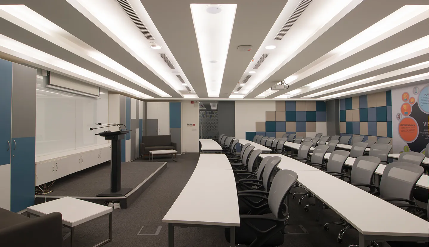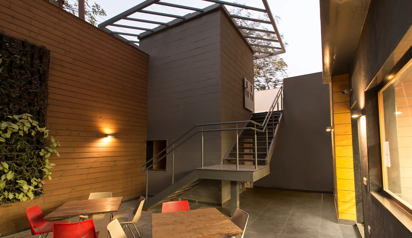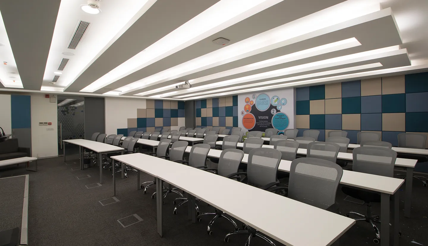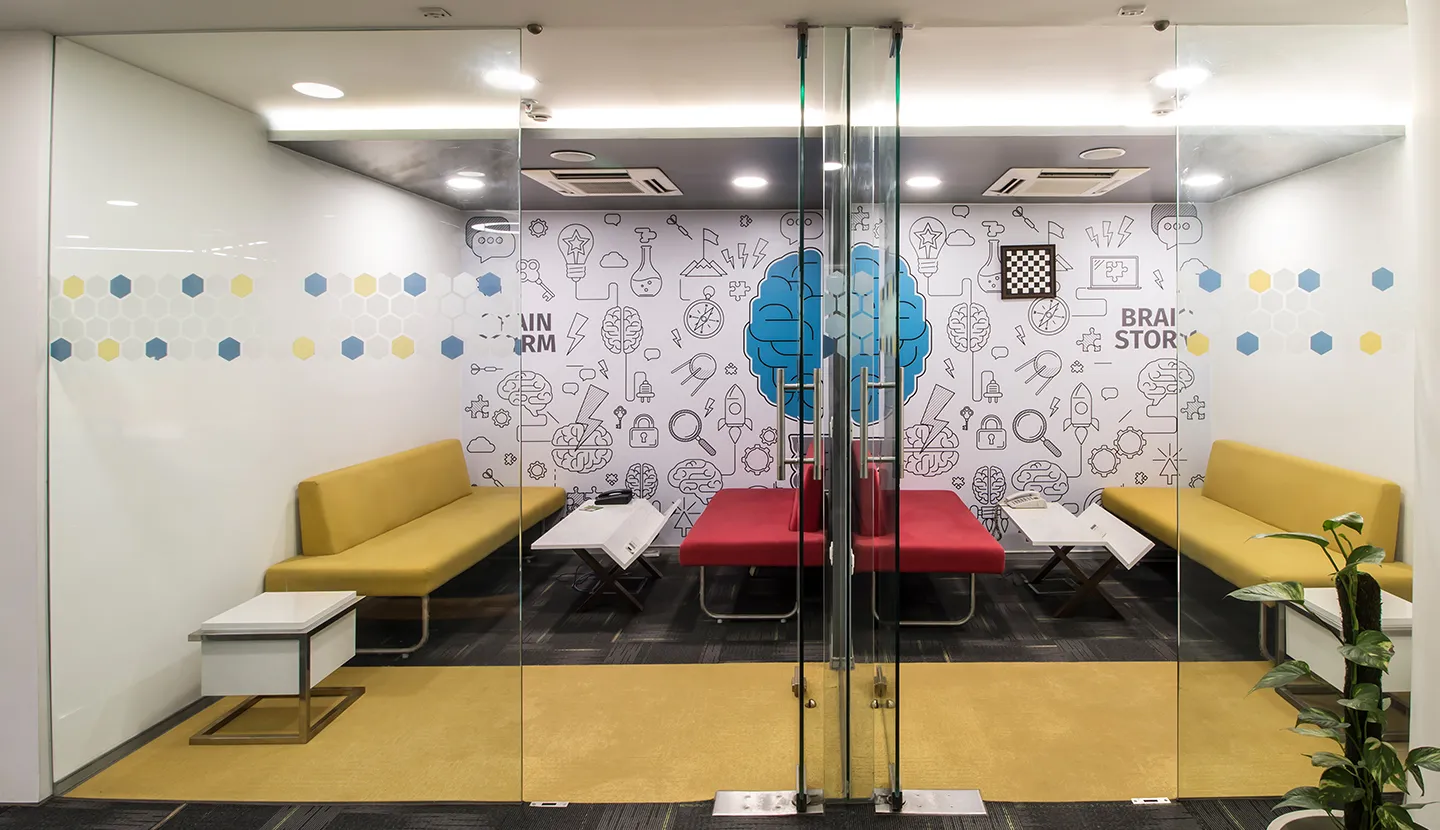 The client was very clear about the hierarchy of spaces. The lowest level is a breakout zone with a Training Room. The Ground, first and second floors are the main work areas, and the space planning for these are in a collaborative format. Each floor is color coded and the workstations are customized. The third floor is the entertainment zone for the employees. They also wanted the brand color to be incorporated in the scheme of things.